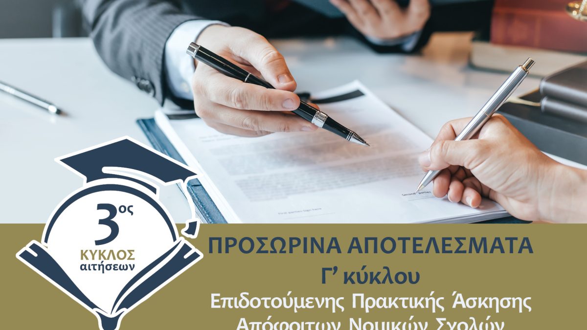 Σας ενημερώνουμε ότι έχουν αναρτηθεί στο Πληροφοριακό Σύστημα της Πράξης «Πρακτική Άσκηση αποφοίτων νομικών σχολών για την απόκτηση ασκήσεως άδειας δικηγόρου», τα αποτελέσματα των αιτήσεων που υπεβλήθησαν στα πλαίσια του Γ΄ Κύκλου του Προγράμματος.